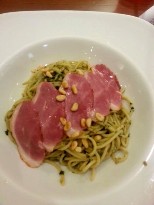 She'd ordered a smoked duck in pesto pasta! Do you see 'em pine nuts