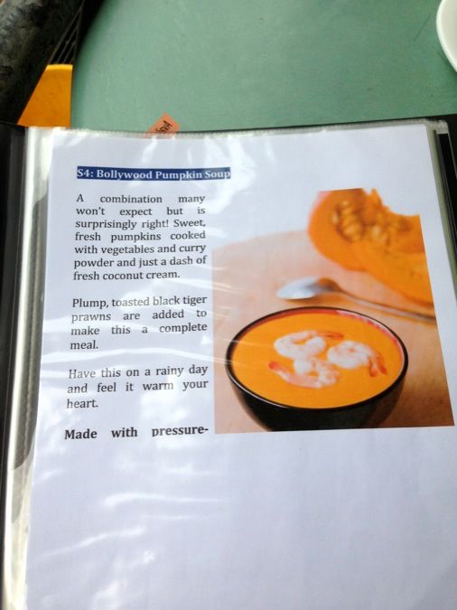 Bollywood Pumpkin Soup. Because I have a slight allergy to seafood, John (the owner) took away the prawns and gave us more soup!