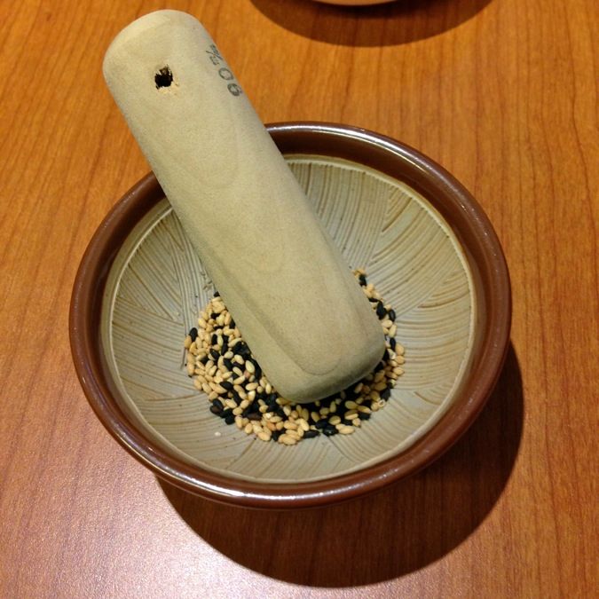 You get to grind your own sesame seeds and smell 'em as the oils are released from the husk