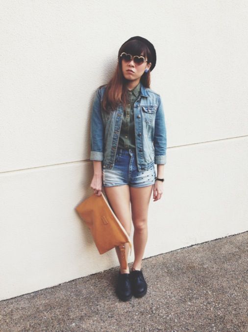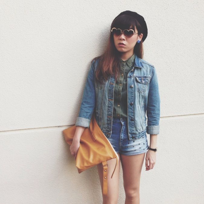 Black beret, F21 // heart sunnies, ASOS // blue flower ear studs, Lovita // forest green button top, studded high waist shorts, Stradivarius // denim jacket, Zara // mustard oversized clutch, Modparade